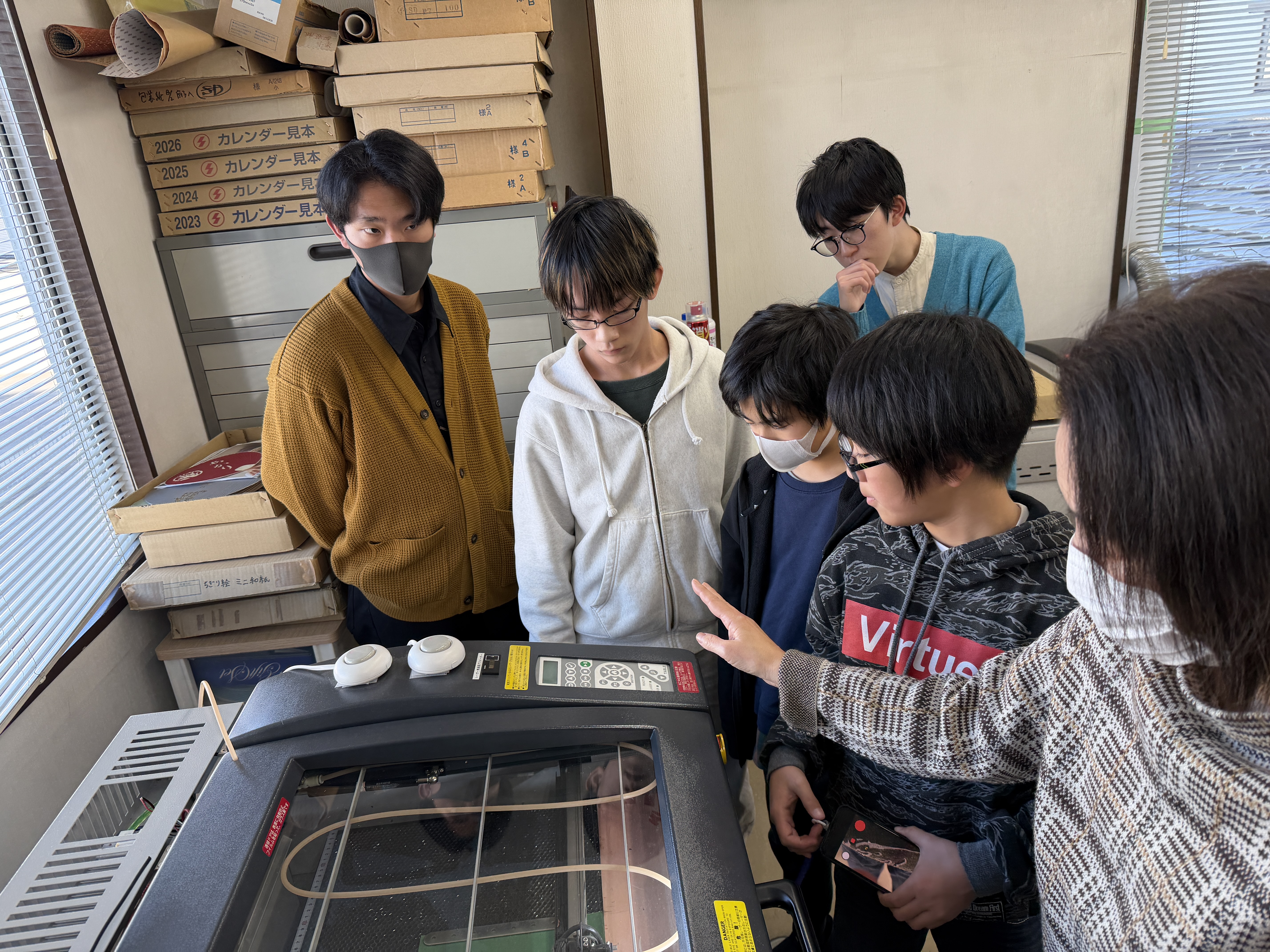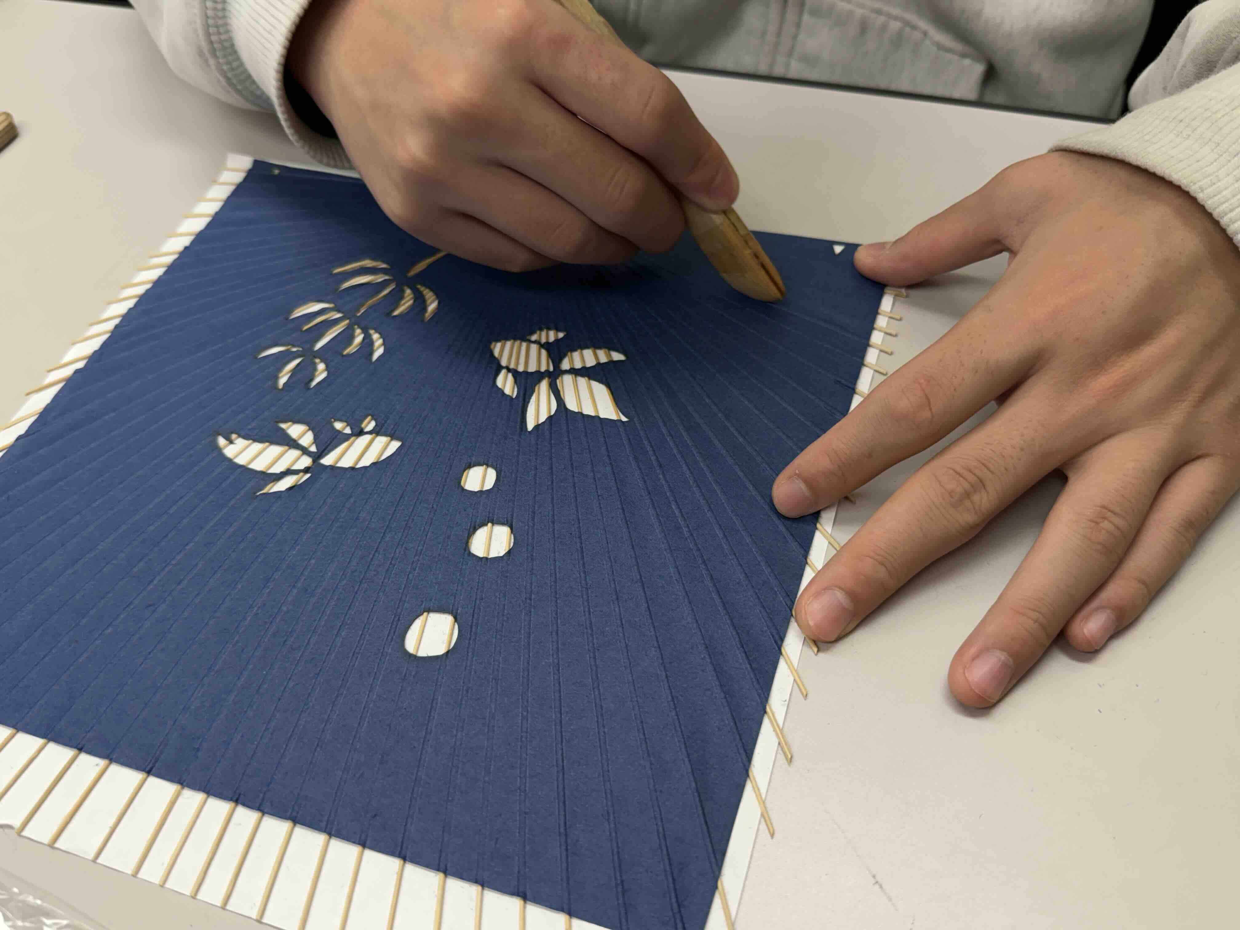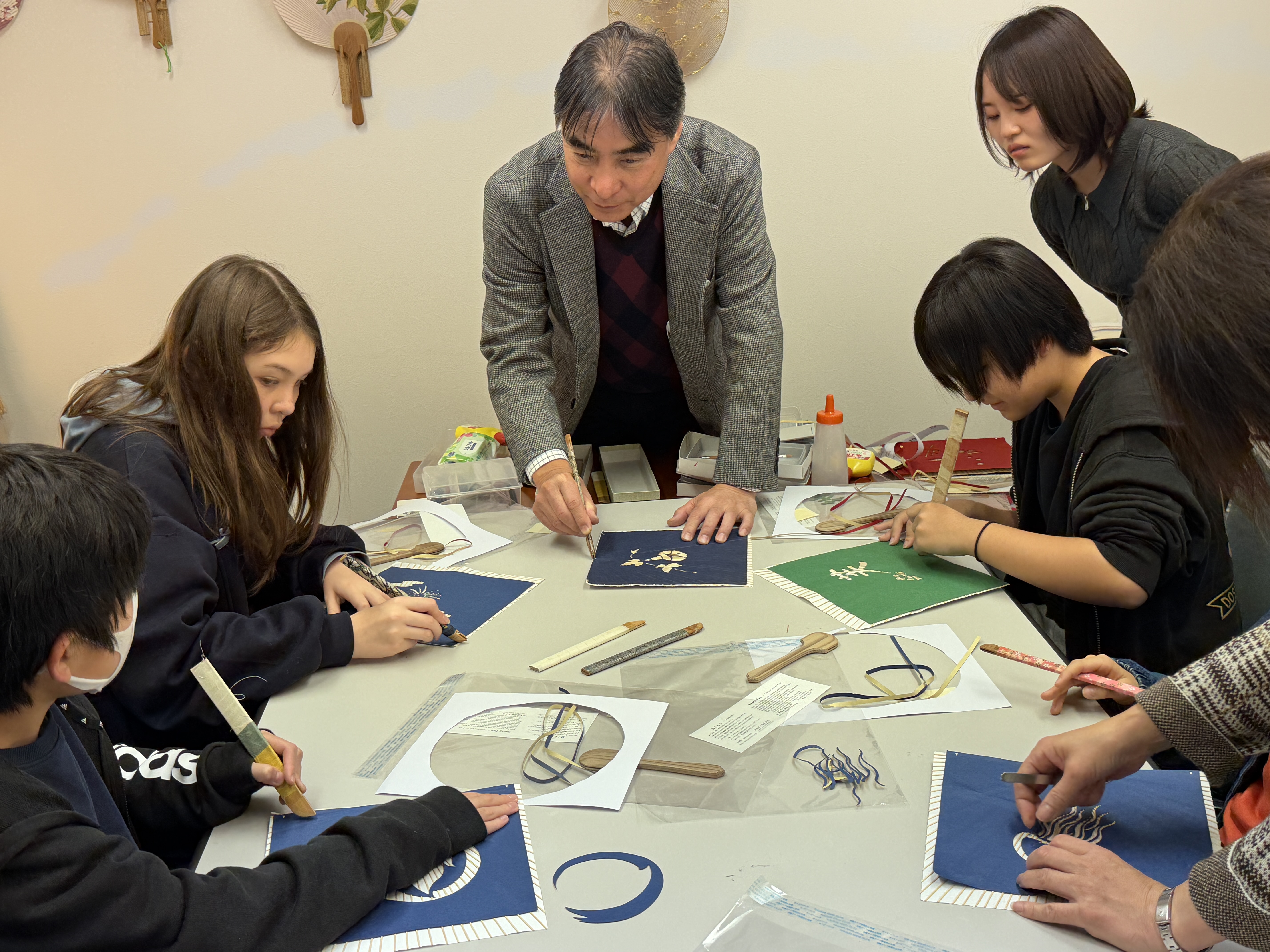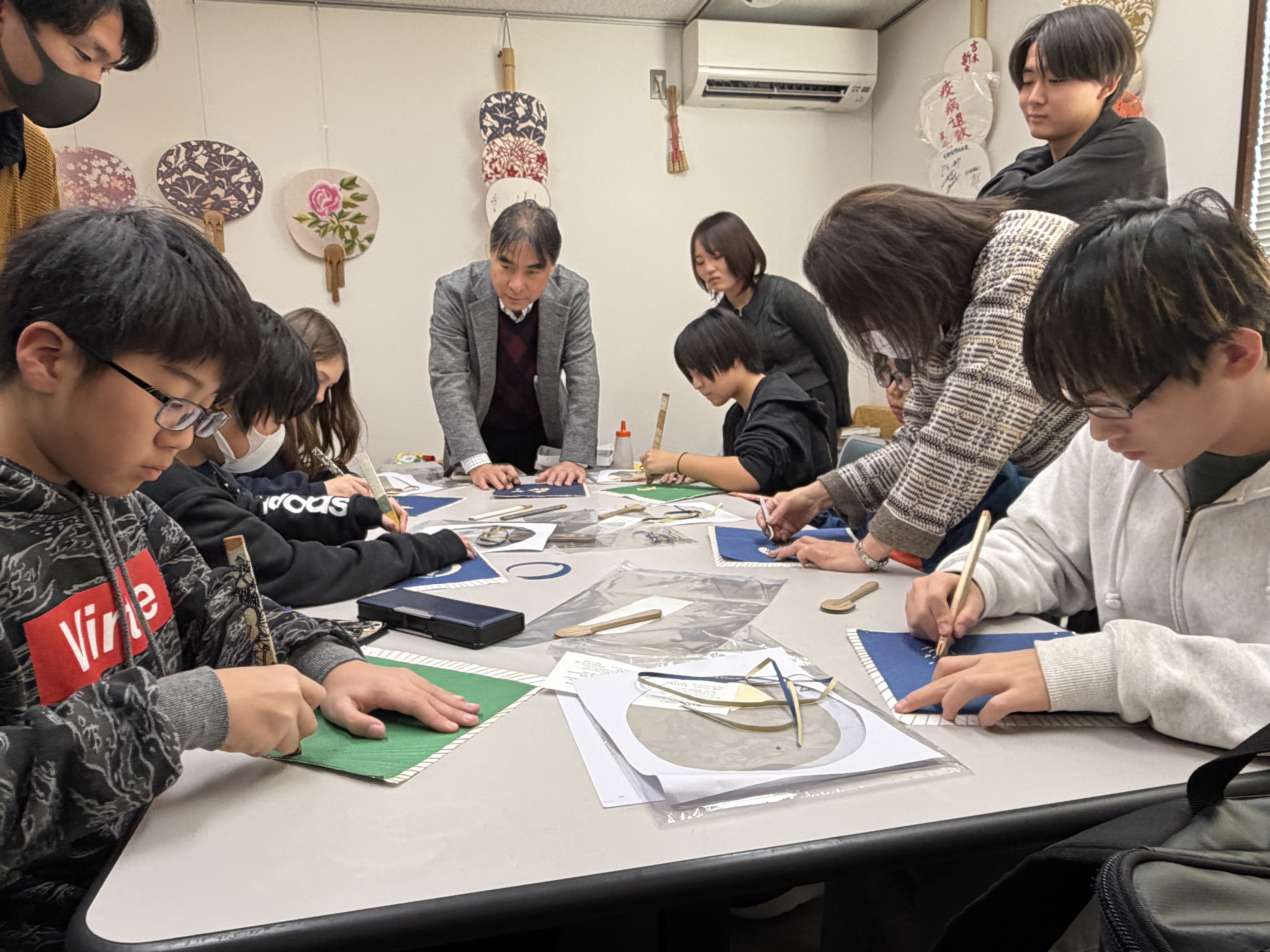 今回は京団扇で有名な「塩見団扇」様を訪問しました。まず講義では京団扇の伝統ある歴史や、伝統産業が高度な分業体制によって成り立っていることを知りました。団扇はかつて生活必需品でしたが、扇風機やエアコンの普及により最近では生産量が減少してきました。一方、海外では装飾品として高く評価されていることも知り、伝統産業の現状と最近の新たな展開をお聞きしました。制作実習では、受講生が事前に塩見団扇様に送付したデザインをもとに、レーザーカッターで手すき和紙に切り出す作業を体験し、その和紙を竹製の骨に糊で丁寧に貼り付けて団扇を完成させました。天然素材を用いる京団扇は環境負荷が低く、SDGsにも通じる点が印象的でした。先端技術と伝統技法が共存する制作現場に触れ、受講生は楽しみながら持続可能なものづくりの魅力と奥深さを実感した貴重な一日となりました。