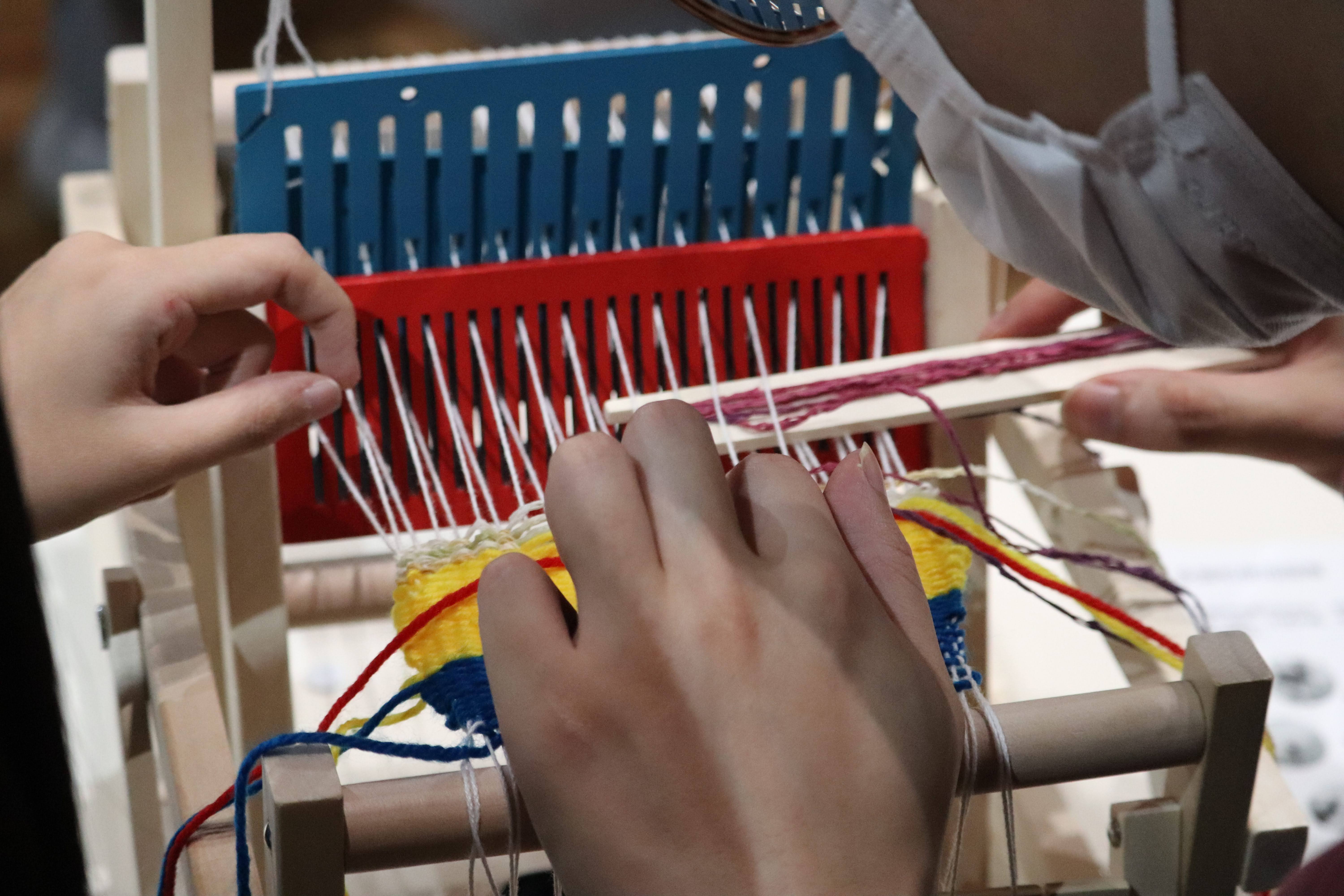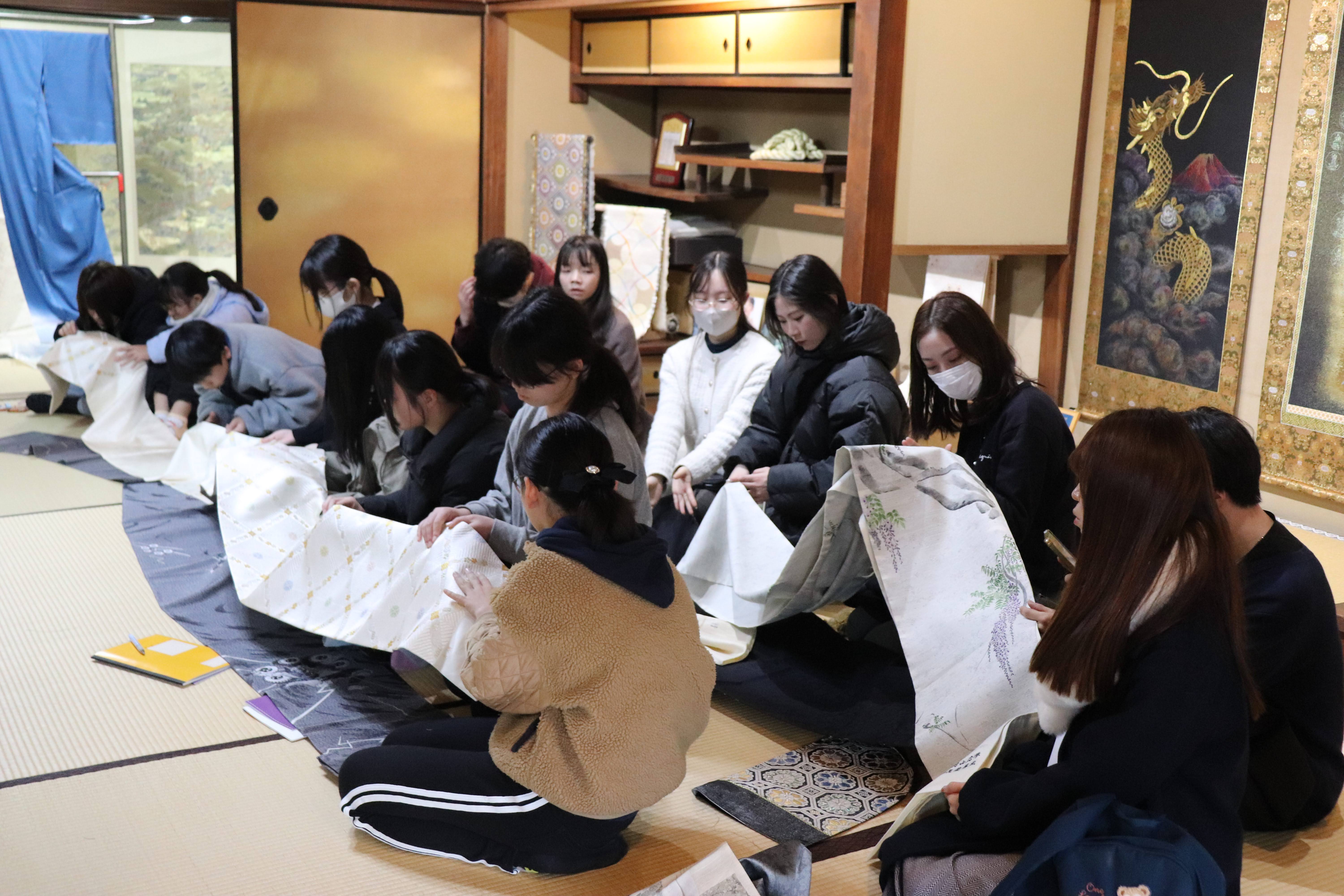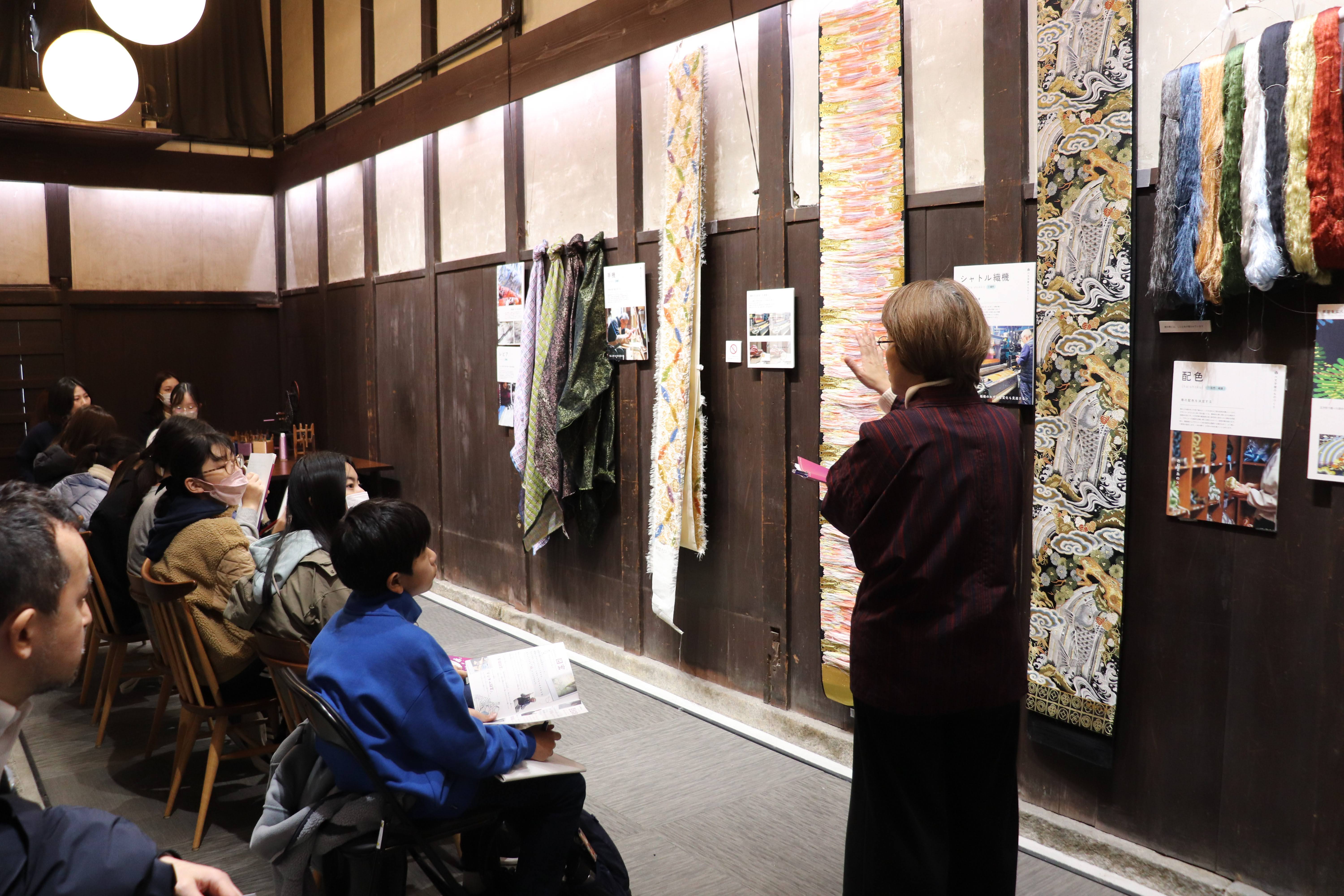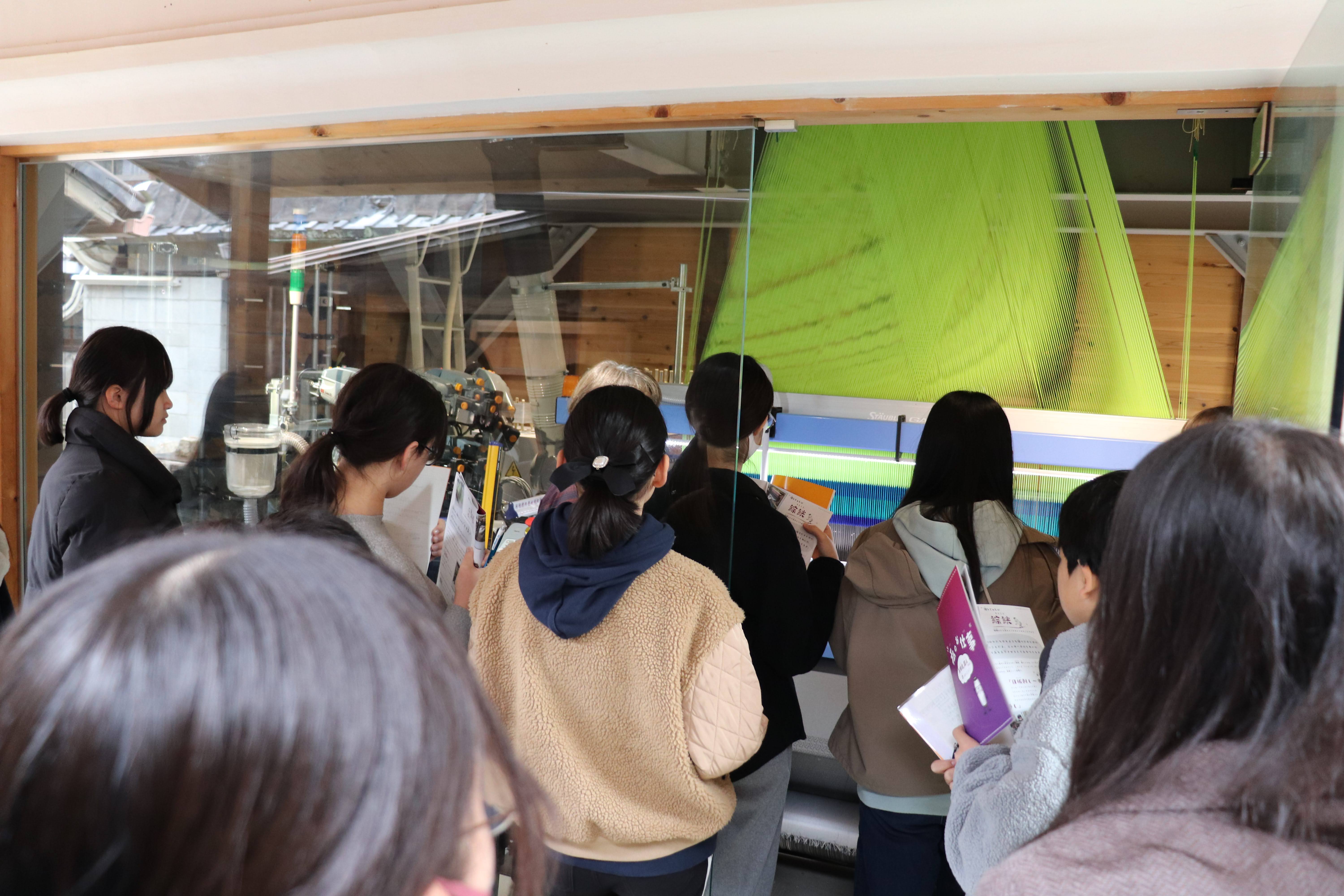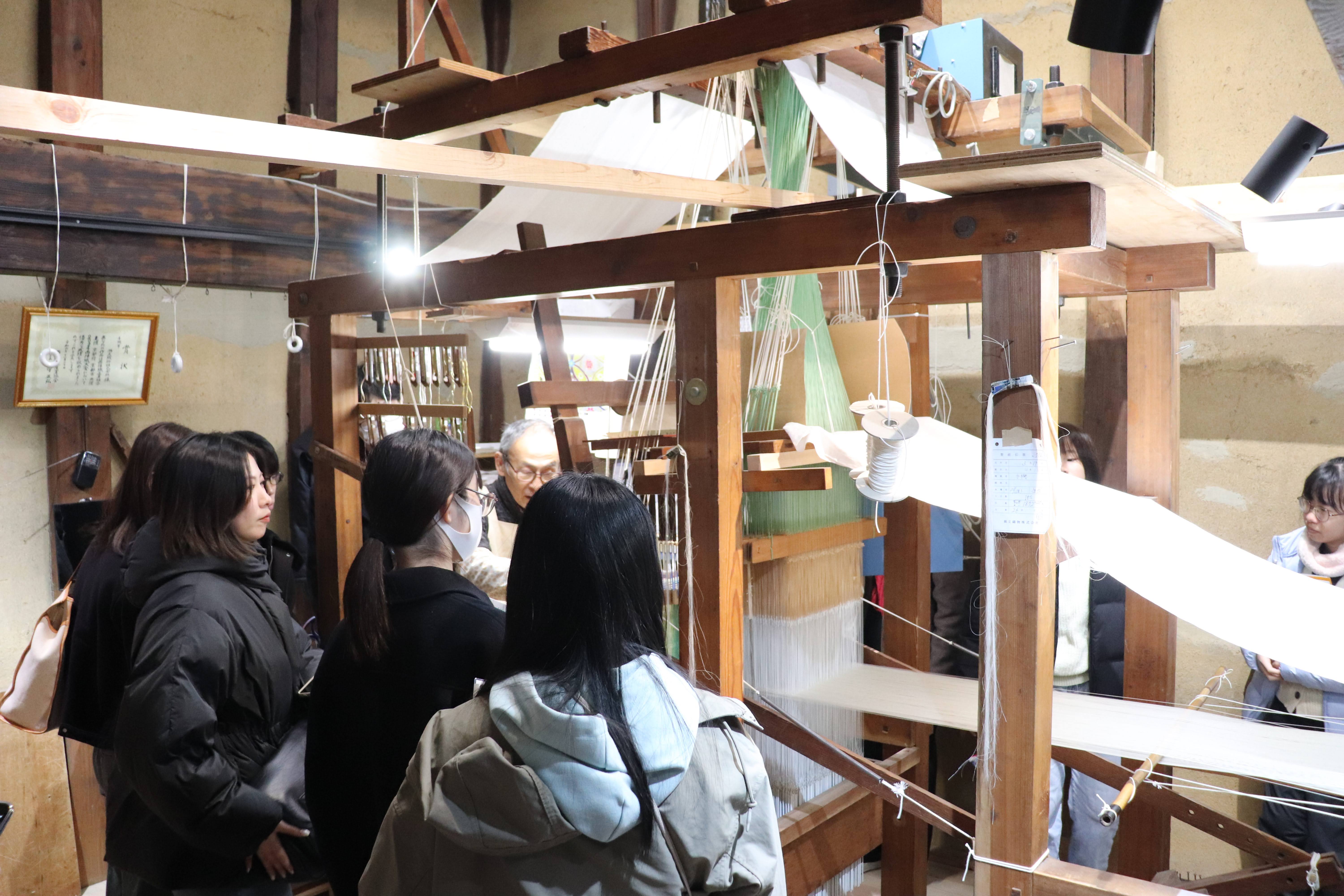 はじめに岡本就介様より、西陣の歴史や織物の制作工程についてご説明いただきました。西陣という名前が応仁の乱に由来していることや、西陣織が多くの職人さんによる高度な分業によって作られていることを学びました。その後、工房に伺い、織機や手織機などを見学させていただきました。手織りの職人さんは高齢化が進んでおり、後継者の育成が簡単ではないという現状も知ることができました。続いて、さまざまな技法を用いて作られた帯を見せていただき、その繊細さや美しさに触れました。最後には、簡易な織機を使い、参加者一人ひとりが織物体験をさせていただきました。