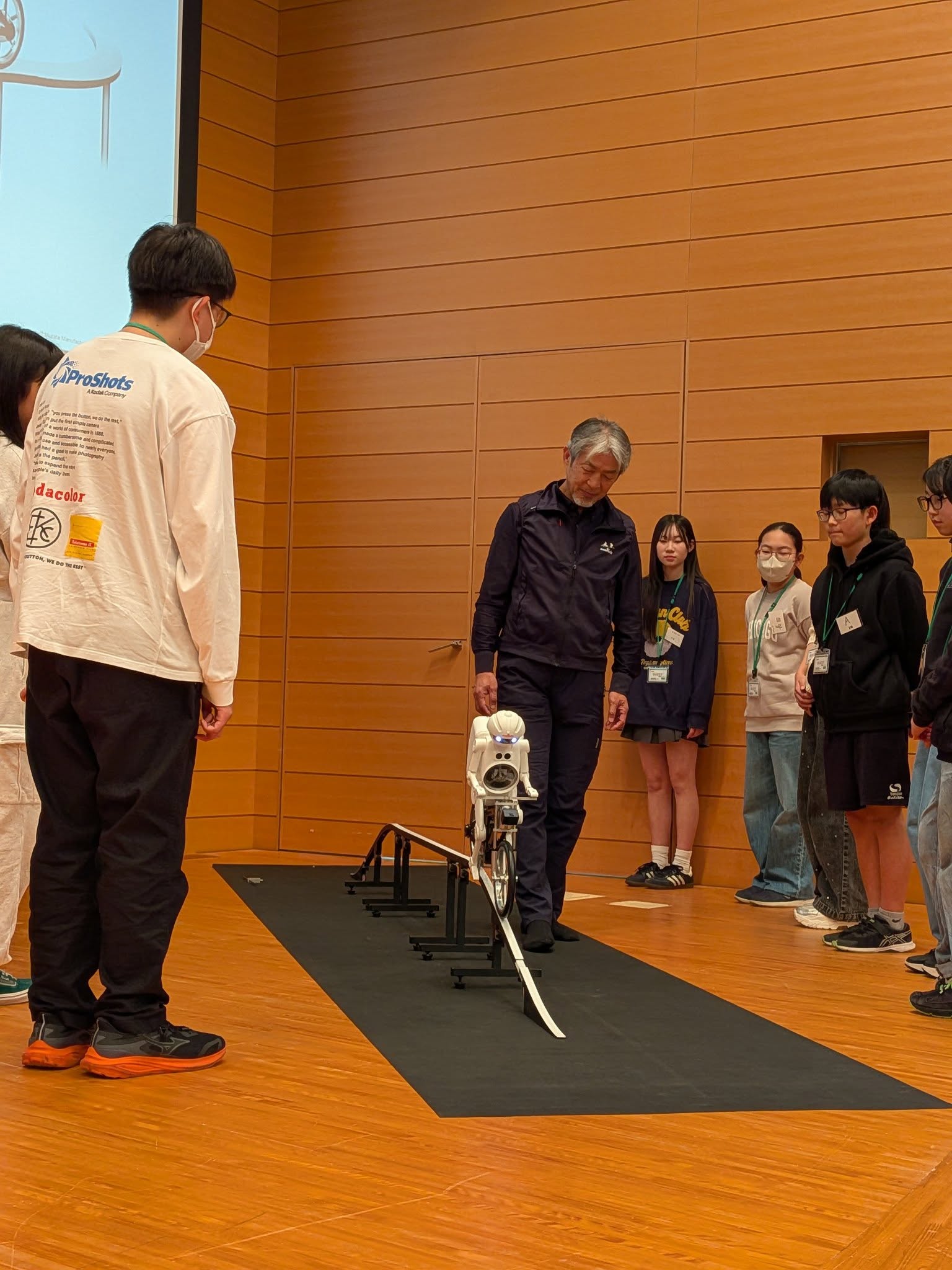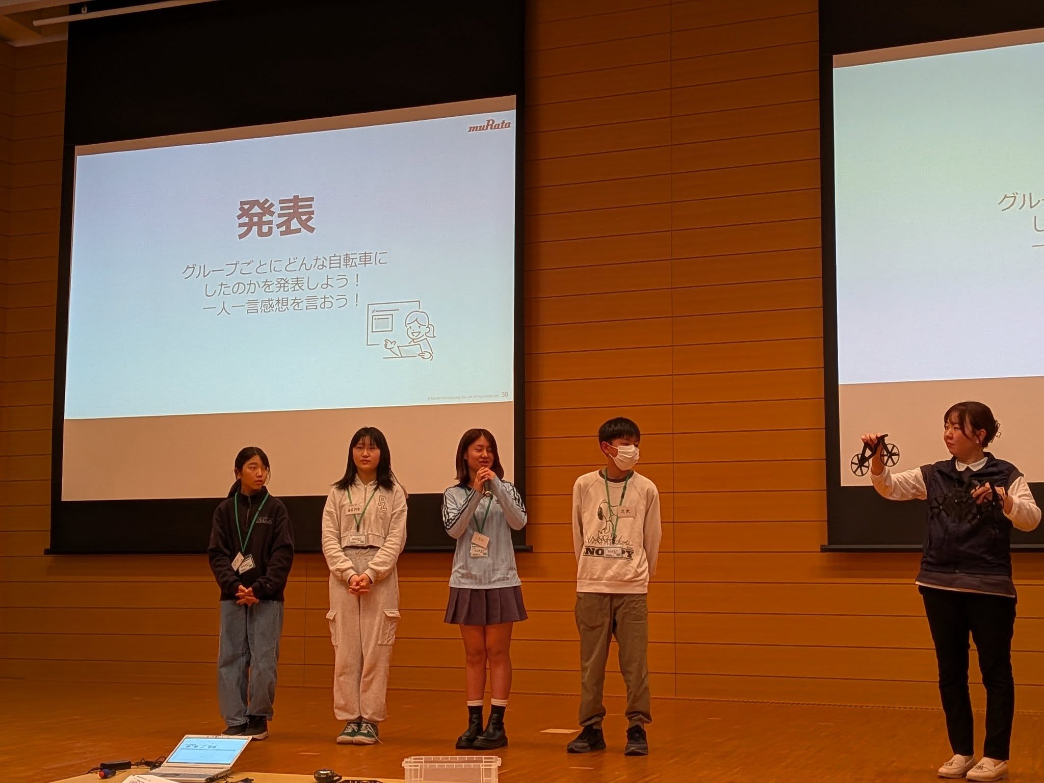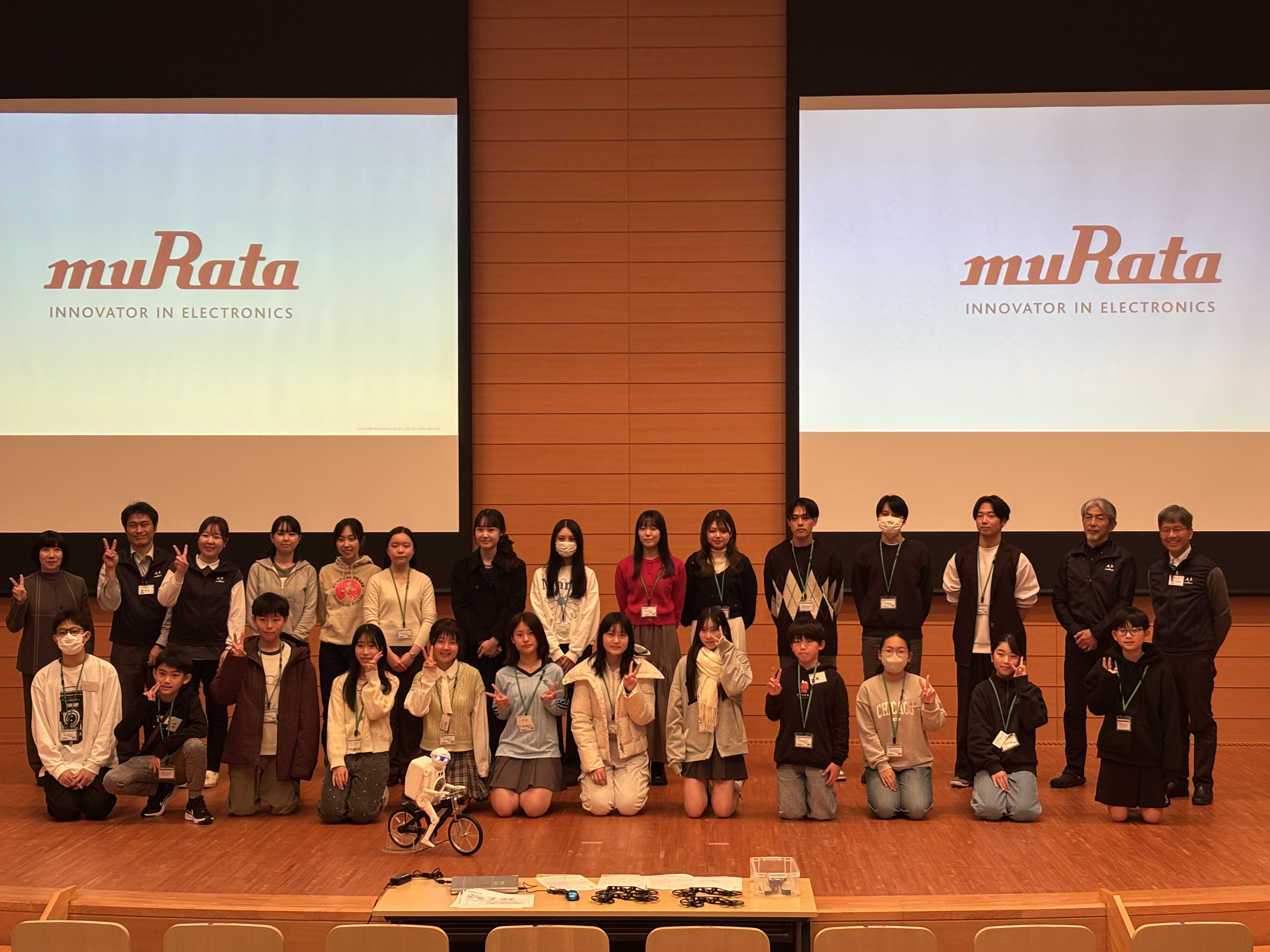 後半には自転車型ロボット「ムラタセイサク君」が登場し、センサーを用いた高度な制御技術を間近で見学。人の操作に近い制御と、人にはできない制御の違いを知ることで、「構造」と「制御」の最適な組み合わせが製品の価値を生み出すことを実感しました。