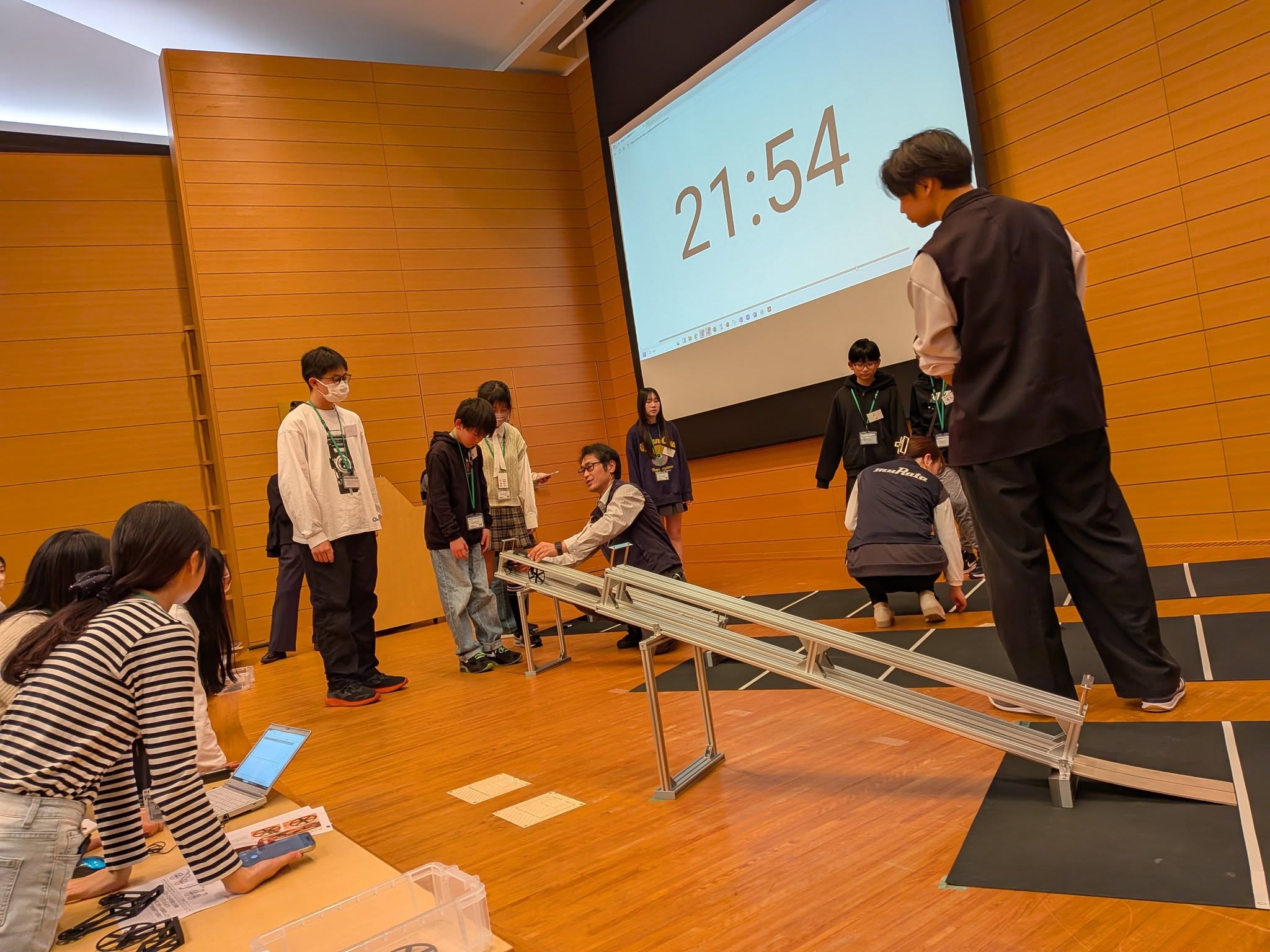 授業を通してのキーワードは「構造と制御」。前半では「バランス」をテーマに、棒立て実験を通して重心や形といった「構造」と、手の動きによる「制御」の関係を体感的に理解しました。続く本講座のために特別に制作していただいたミニチュア自転車の製作・走行実験では、タイヤの大きさや軸の位置など条件を変えながら測定を繰り返し、より安定して走る構造を探究しました。結果を比較し、調整を重ねる中で、「安定性」や「再現性」が製品設計において重要であることを学びました。
